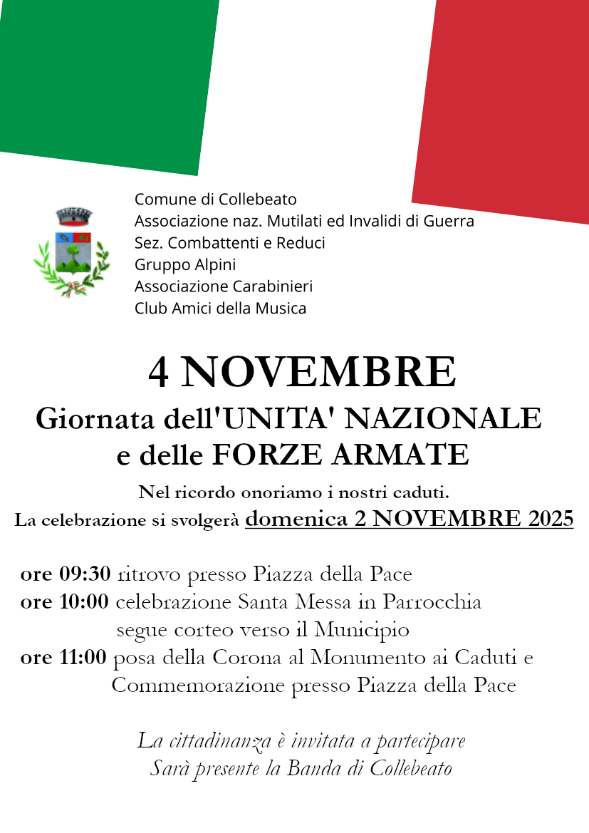 ore 11:00 posa della Corona al Monumento ai Caduti e Commemorazione presso Piazza della Pace