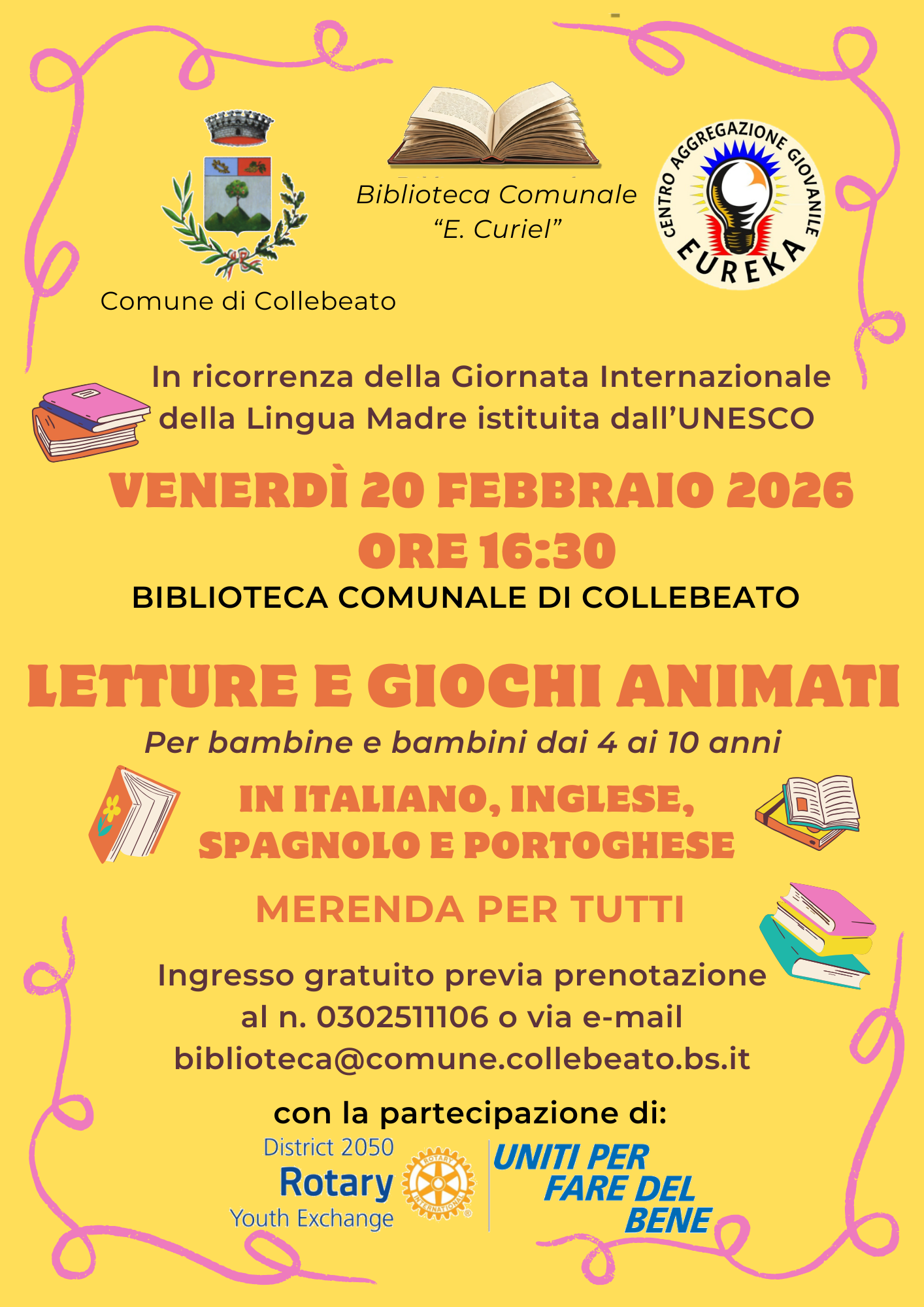 Ingresso gratuito previa prenotazione al n° 0302511106 o all'email biblioteca@comune.collebeato.bs.it