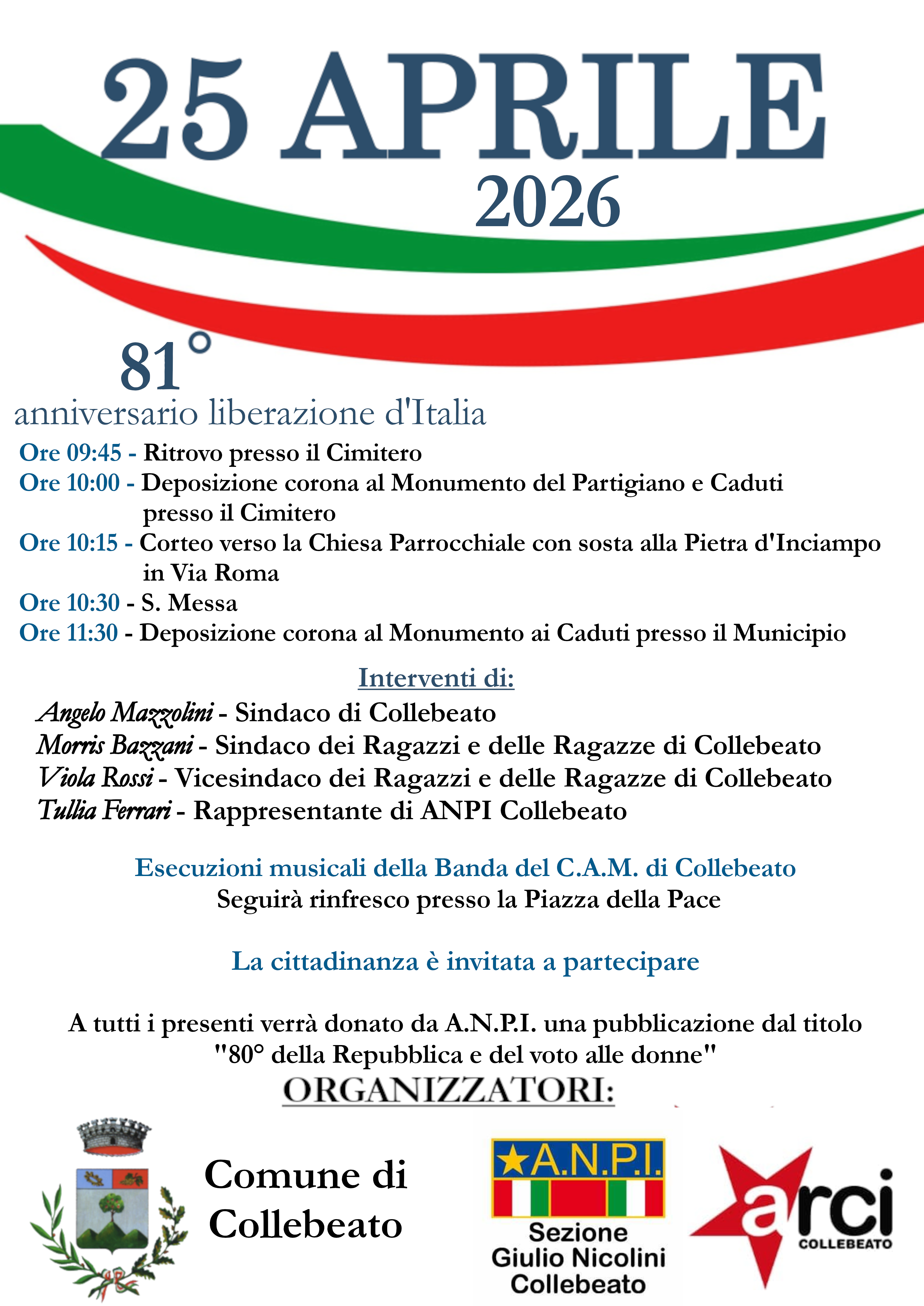 A tutti i presenti verrà donato da A.N.P.I. una pubblicazione dal titolo "80° della Repubblica e del voto alle donne"