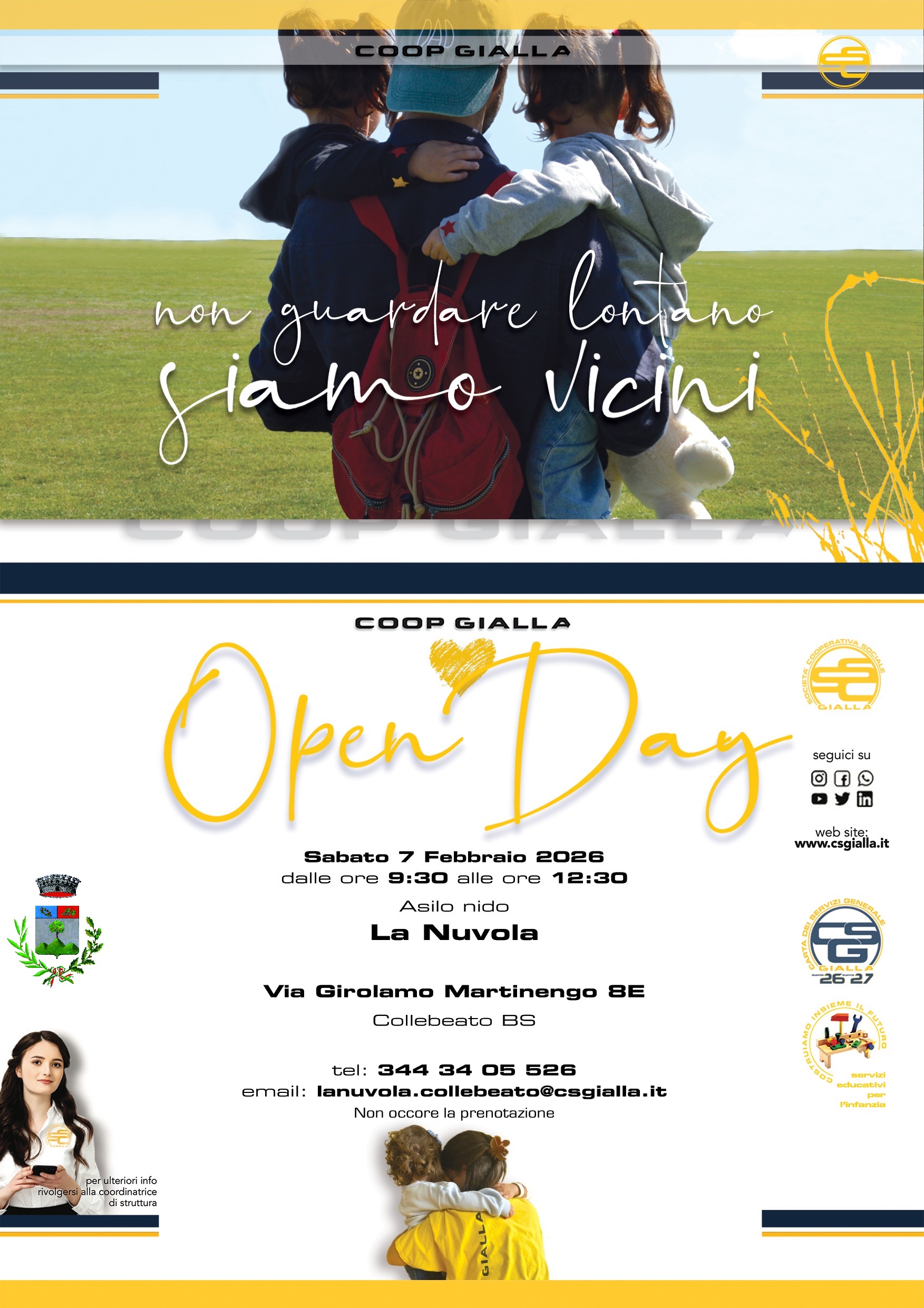 Si pubblica la locandina per l'Open Day a.e. 2026-2027, fissato per sabato 07/02/2025 dalle ore 09:30 alle ore 12:30 presso il nido "La Nuvola" in via Girolamo Martinengo 8/E. Per partecipare non è obbligatoria la prenotazione obbligatoria. Per maggiori informazioni è possibile contattare il numero 3443405526 o l'indirizzo mail lanuvola.collebeato@csgialla.it. Verrà inviata inoltre una lettera di invito a tutte le famiglie con figli nati nel 2024 e nel 2025 e residenti a Collebeato.